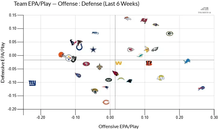 Each week we present the league through the lens of a single image. While no one picture or stat can truly shoulder such a load, learning to take the temperature of each team’s offensive and defensive expected points added (EPA) will sharpen your game—this per-play metric that defines the value of each play by the effect it has on the offense's likelihood to score.