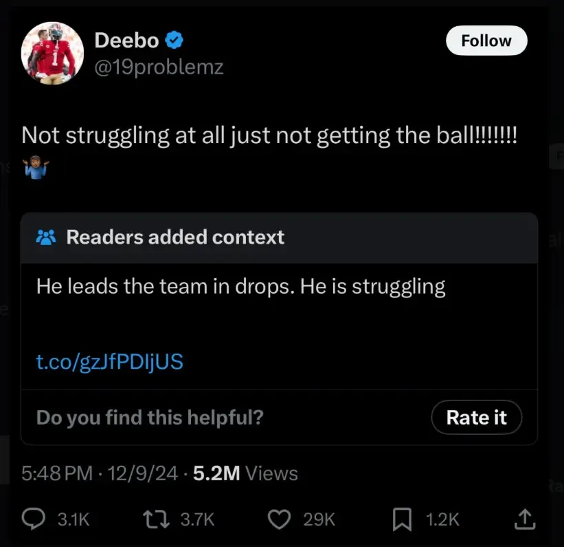 The 49ers WR started his Week 15 by getting reminded about the dangers of social media after he complained about not getting enough opportunities on X.com and then getting “community noted”.