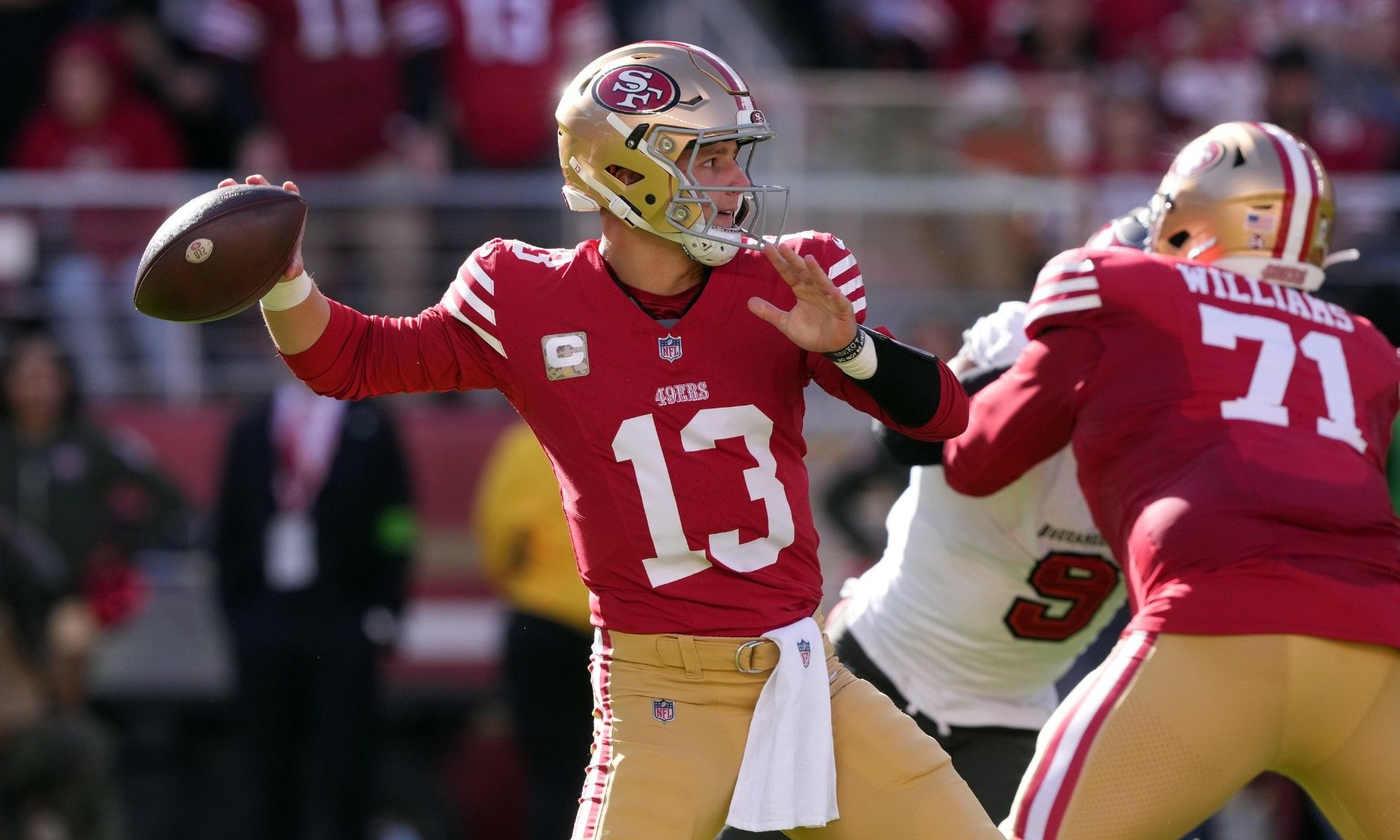 Nov 19, 2023; Santa Clara, California, USA; San Francisco 49ers quarterback Brock Purdy (13) passes against the Tampa Bay Buccaneers during the first quarter at Levi's Stadium. Mandatory Credit: Darren Yamashita-USA TODAY Sports