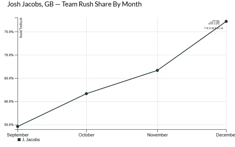 Betting on the starting running back for a double-digit favorite at home with playoff implications on the line shouldn’t take too much explication. Green Bay brought in Josh Jacobs to reliably shoulder the load through the cold, precisely what the veteran free agent has done (image below).