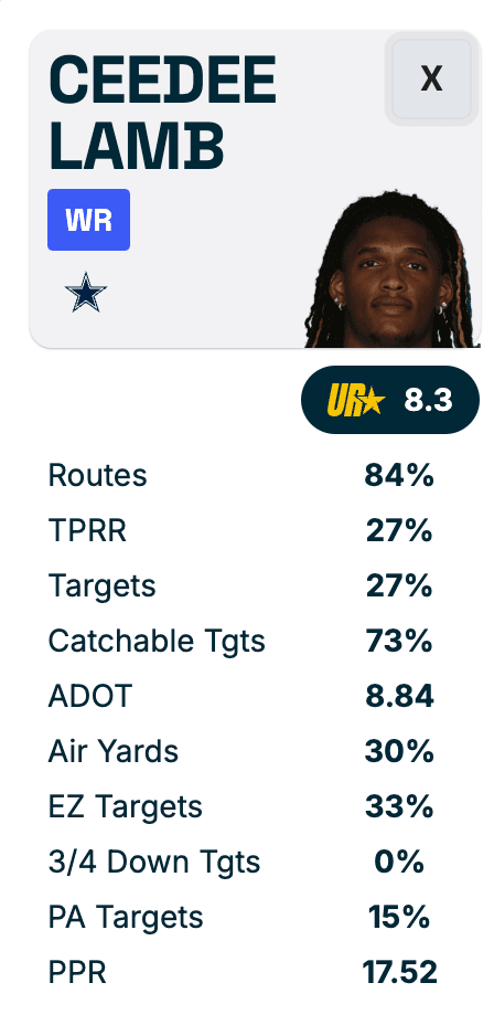 After a rough patch out of the gate reading injury tea leaves, it’s been mostly sunny skies since taking a proactive rather than reactive approach. You have to watch those injury reports carefully, especially when it comes to downgrades. We don’t know if CeeDee Lamb’s back injury is legit. That’s part of the game. I do think another DNP sparks a market reaction. I know boomers tend to scoff at a single position player’s impact but Lamb’s responsible for nearly one-third of the Cowboys’ vertical game. He’s the only potential mismatch on the field, especially with Jake Ferguson also trending to miss the contest. Circling the drain may be an understatement. From our Utilization Report: