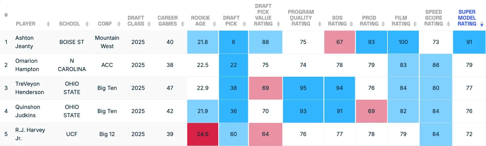 There are plenty of things to like in his profile, most notably his breakaway rush rate and missed tackles forced, which were both top 10 in college football last season. Despite being a smaller back, he still handled 240+ rush attempts in back-to-back seasons, which is a positive indicator for his ability to stand up to the punishment of an NFL season.