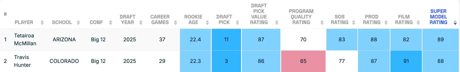 Hunter ranks just behind Tetairoa McMillan in the rookie WR Super Model, but is only dinged for program quality and strength of schedule. His production and film ratings are on par or better than McMillan, who is a very good prospect. If we knew Hunter was going to be a full-time WR, he would be my WR1 in this class.
