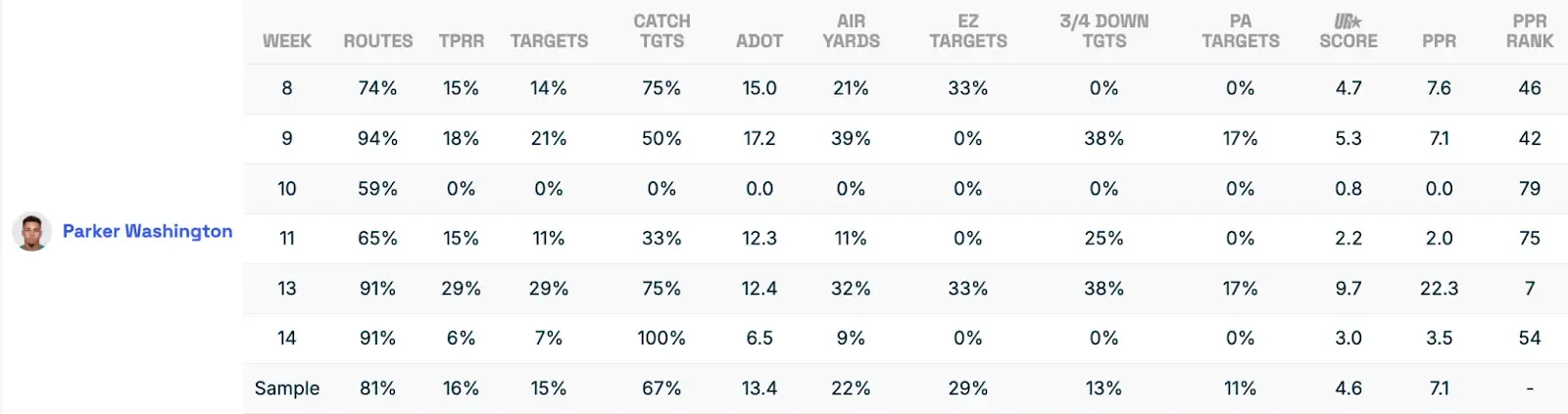 One player who fits that description is second-year WR Parker Washington. With Christian Kirk and Gabe Davis both out for the year Washington has stepped into a bigger role with a route participation of at least 90% in three of his last five games.