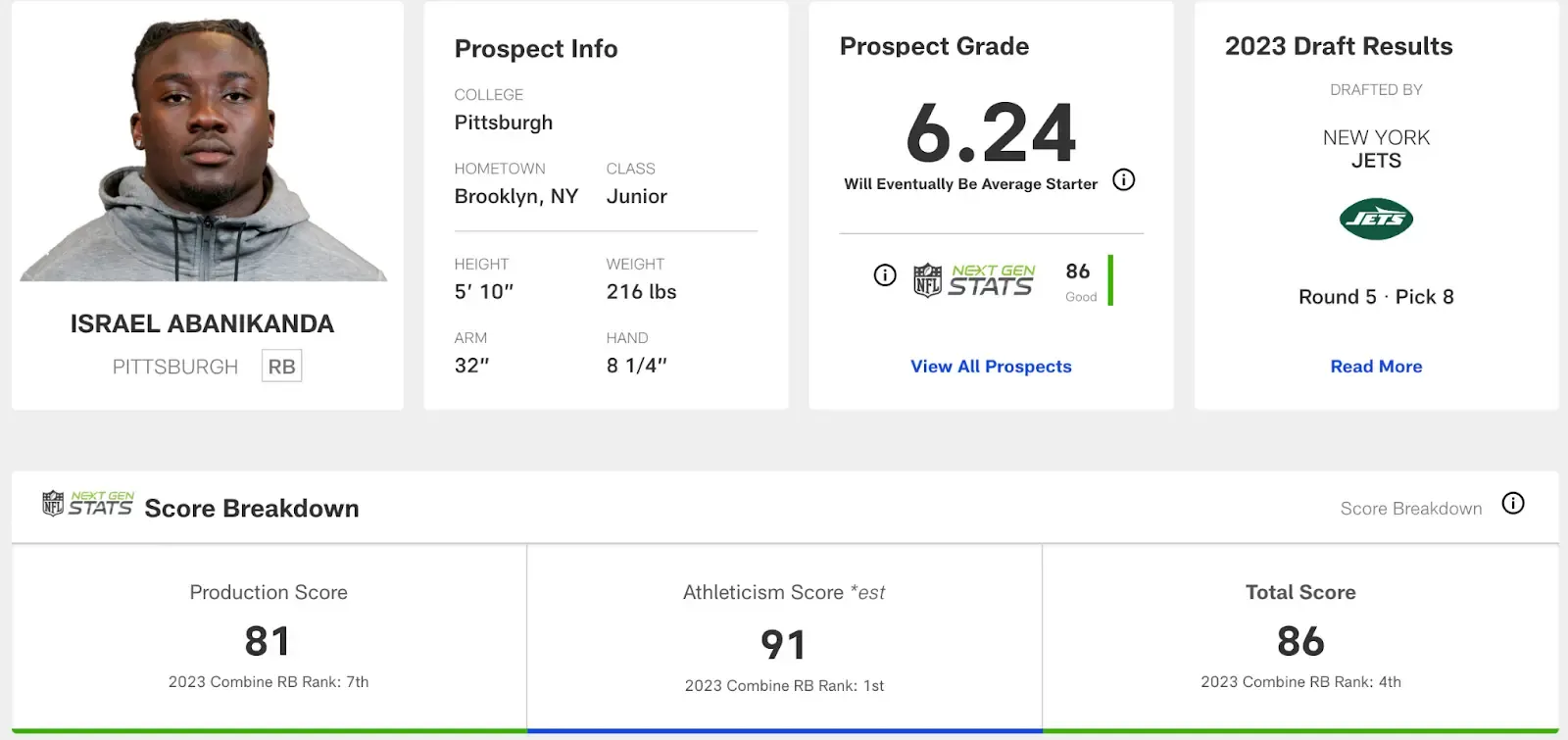 I've had to adjust my expectations since he didn't even make it two seasons with the team that drafted him, but there are still reasons to hold out hope that he could develop into something down the road. Abanikanda is still one of the youngest players in the NFL having just turned 22 years old in October. He's also extremely athletic and finished with the highest athleticism score of all RB prospects at the 2023 NFL Combine per Next Gen Stats.