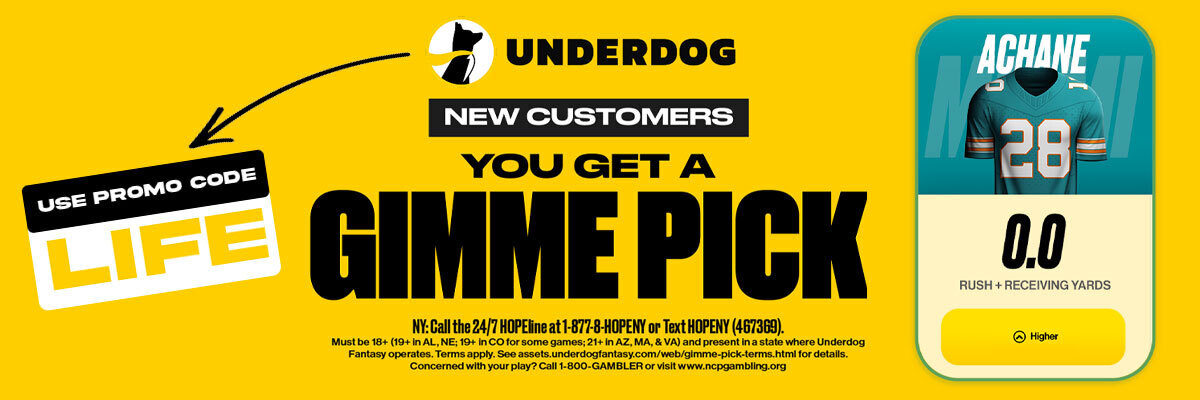 Sign up and claim your free pick today! Pick higher or lower on your favorite players and cash in on Underdog today! New customers will receive a FREE De'Von Achane pick when you sign up. Sign up for Underdog using our promo code: LIFE and you can earn up to $1,000 Bonus Cash on your first deposit!