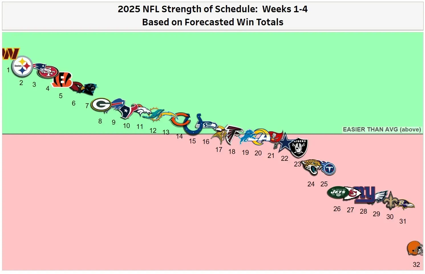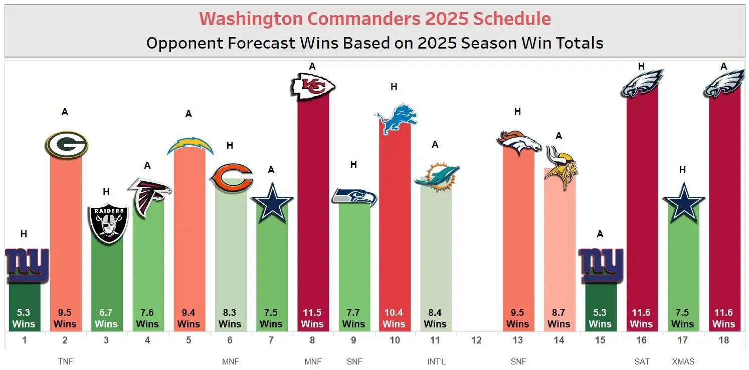 “No team has an easier start to the season than the Washington Commanders; only 1 opponent is expected to have a winning 2025 season.”