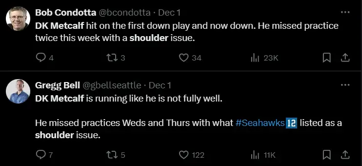 DK Metcalf (shoulder): Metcalf missed the first two practices before Week 13. So, an LP-DNP start to the week isn't too concerning. However, even though Metcalf was active last Sunday, the in-game reports likely made most gamers wish they had started someone else.