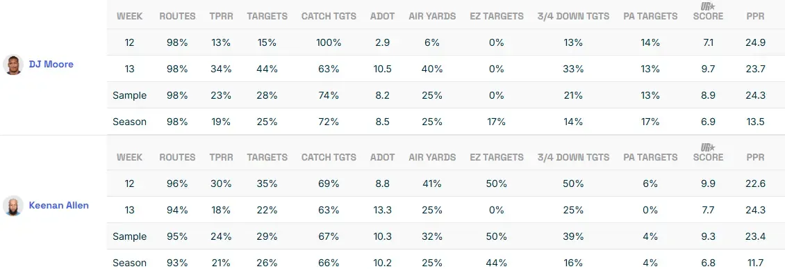 Allen and Moore essentially switched places in the pecking order on Thanksgiving. Luckily, the former Chargers WR found the end zone twice to boost his box score tally. Caleb Williams has limited negative plays and averaged 236.8 passing yards per game over the last month. Looking to his pass catchers for help during the Week 14 Bye-Pocalypse would be a reasonable move.