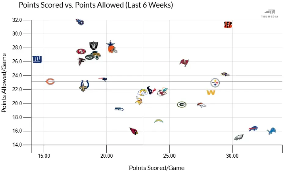I also charted the entire league’s average total points scored per game as another simple reference tool. This beauty will help you find the wagons worth hitching to in a pinch.