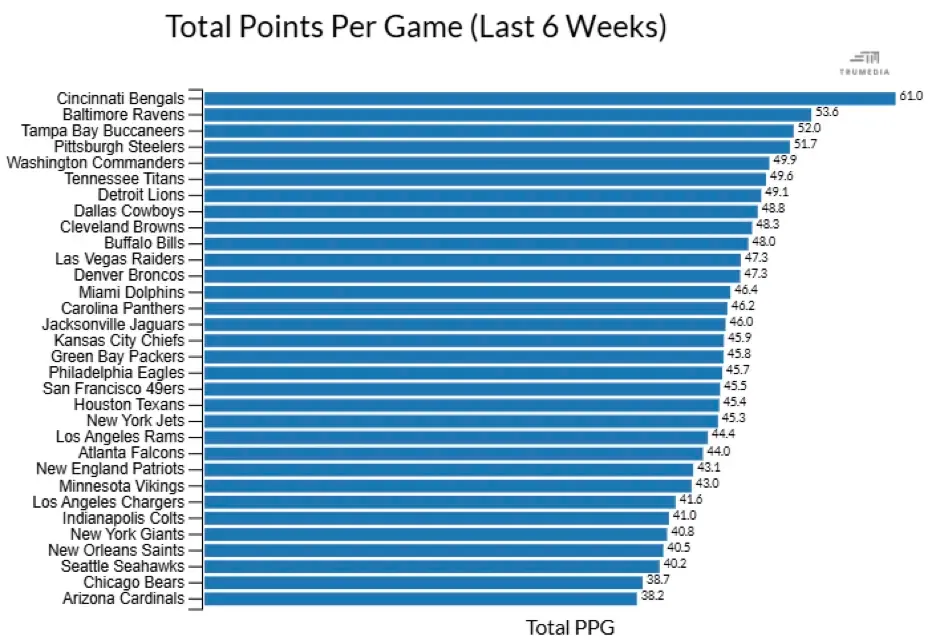 Cowboys (vs Bengals) — The 2024 Bengals could have been dreamt up in a fantasy lab somewhere. This stat’s almost hard to believe. Since Week 9, Cincinnati’s game totals averaged an absurd 69 points per contest. What?!? If that sounds insane, it is. For you math whizzes out there, that’s 30% more than the next team, and almost 25 points higher than league average. Wow. And Cincy’s got very little, if anything, to play for. Queue up your Cowboy pass catchers against soon-to-be former defensive coordinator Lou Anarumo’s secondary. Cee Dee Lamb’s a no-brainer. The combination of Brandin Cooks and Luke Schoonmaker however, may be widely available to serve in a pinch. Should be enough love to go around, considering Cincinnati’s allowing +325 passing yards/game this month and we’ve got a 50-point game total on our hands—the perfect recipe for fantasy goodness.