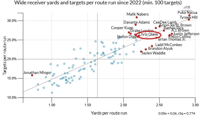 The only WRs with better three-year marks in this separation-based metric: Malik Nabers, Diontae Johnson, A.J. Brown, Tyreek Hill, CeeDee Lamb, and Zay Flowers. That's awfully good company, and the per-route numbers back up the idea that Olave deserves to be considered one of the position's top young talents.