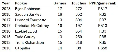 - 2023: Sets an NFL record with 7.8 yards per carry on his way to racking up 997 total yards and 11 scores in just 11 contests–good for RB5 status in PPR points per game.