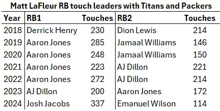 Here's my only concern: Jacobs ran as pure as anyone when it came to his backfield mates going down with injuries. A.J. Dillon (neck) missed the entire season, and third-rounder MarShawn Lloyd (hamstring, ankle) only wound up playing one game all year.