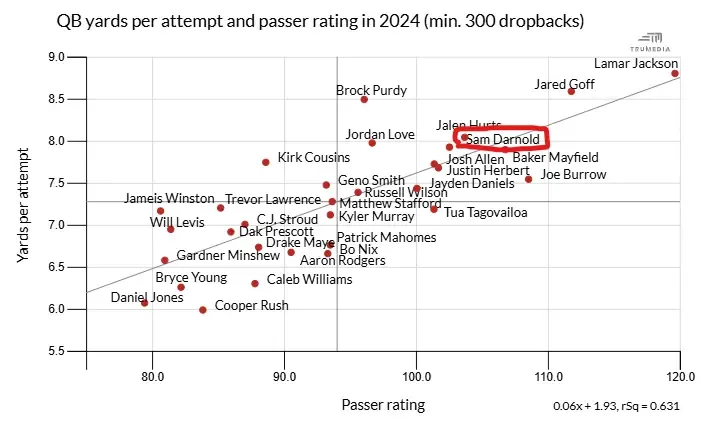 While all those dollar amounts sound like a lot for QBs who won't exactly be confused as top-five players anytime soon, that's the going rate for very good QB play in the year 2025. It remains to be seen if Darnold will be able to replicate his 2024 magic in a new environment, but make no mistake about it: The man was pretty, pretty, pretty great during his one-year campaign in Minnesota.