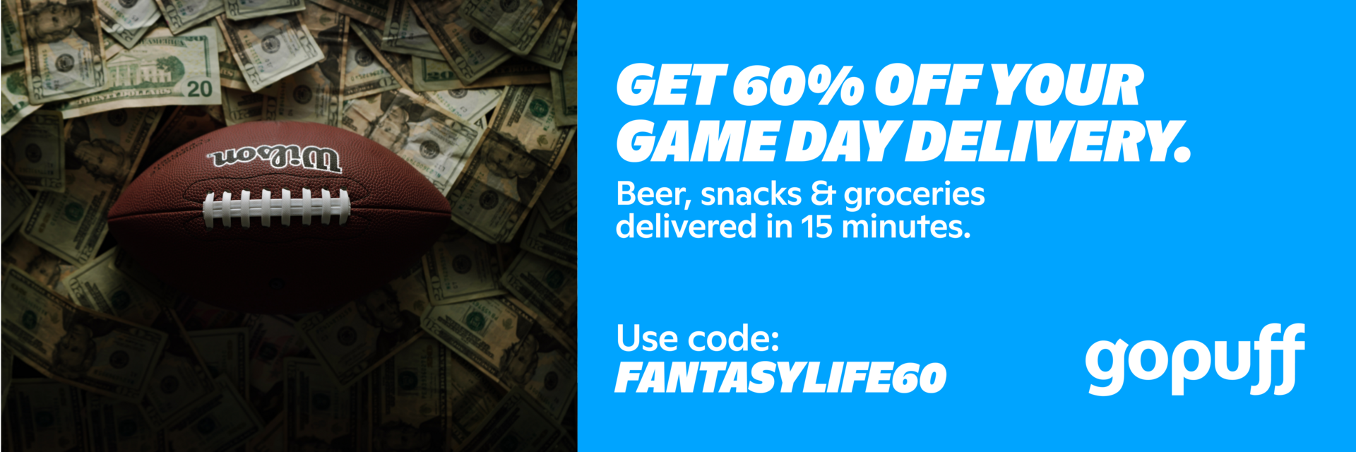 Dominate your fantasy football season with the Gopuff Draft Champion—your ultimate sidekick for gameday glory. While you’re managing your lineup, Gopuff keeps your snack game just as strong, delivering beer, snacks, and groceries in as fast as 15 minutes. No more last-minute store runs or missing key plays, just tap the app and your favorites are on the way. Whether it’s chips for the pregame, pizza for halftime, or a cold beer for your victory toast, Gopuff has you covered all season long. And because champions deserve perks, new customers get 60% off their first order with code FANTASYLIFE60.