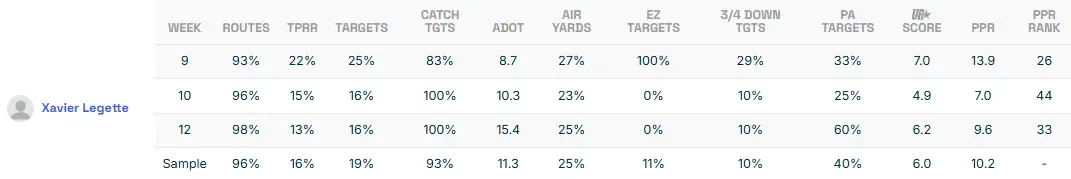 Legette has taken over a full-time role since the departure of Diontae Johnson. Over the last three games, he has a 96% route participation rate with a 19% target share. Over that spa,n he has two WR3 finishes with 10.2 points per game.