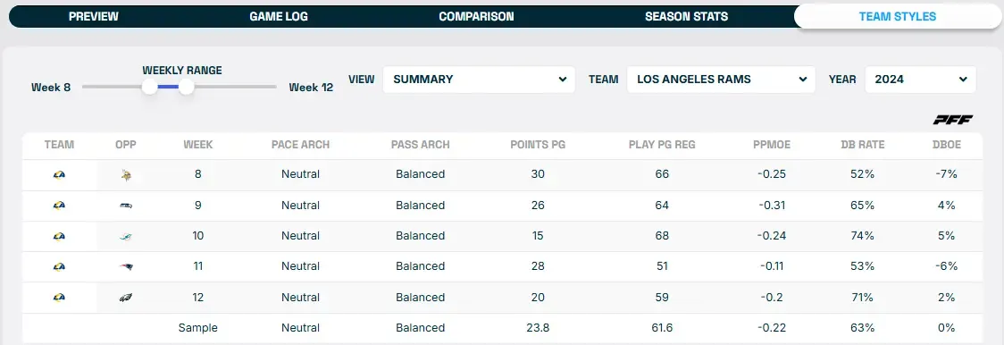The Rams have thrown the ball more since the return of Cooper Kupp and Puka Nacua in Week 8 but have remained a balanced offense with a 0% dropback rate over expected (DBOE).