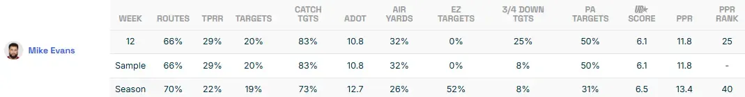 The Buccaneers didn't push it with Evans in his first game back, limiting him to a 66% route participation in a landslide victory. The veteran WR made the most of his opportunities, leading the team with a 29% TPRR, but didn't blow up in the fantasy box score (11.8).