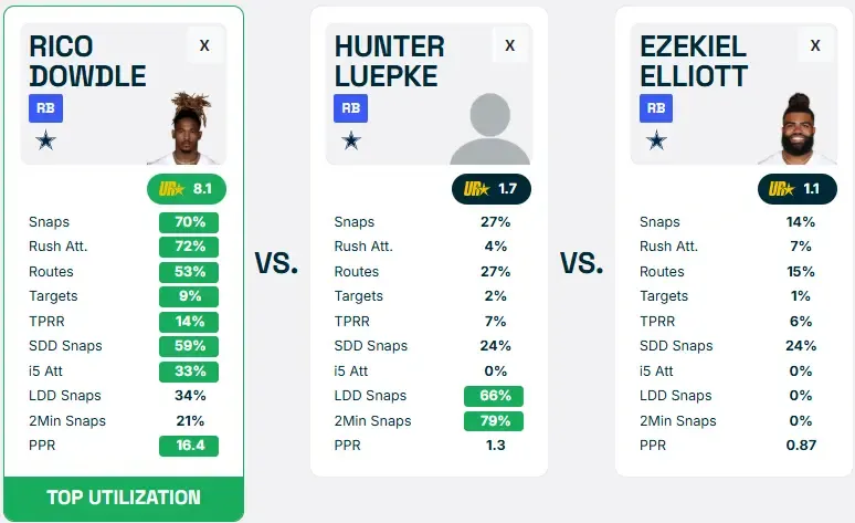 Over the last three games, Dallas has turned to Dowdle as a near-every-down back with a 70% snap share and 8.1 Utilization Score, averaging 16.4 points per game. He continues to give way to Hunter Luepke in long-down-and-distance (LDD) situations and the two-minute offense, but Dowdle has usurped almost all of the early-down work from Ezekiel Elliott.