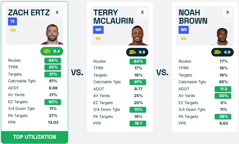 With the fantasy playoffs underway, I just couldn't refuse to get one of our early-season favorite sicko starts back into the column. But make no mistake, Ertz deserves the nod as a sicko start—he leads the Commanders' pass catchers in Utilization Score (8.4) and target share (21%) over the last four games.