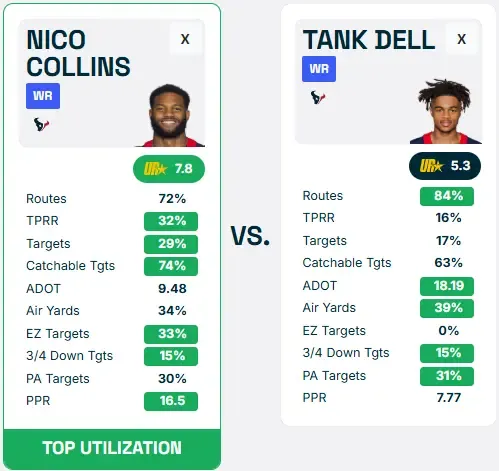 Dell has been an afterthought since the return of Nico Collins in Week 11. Over the last three games, he has a 17% target share with a 5.3 Utilization Score, averaging 7.8 fantasy points.