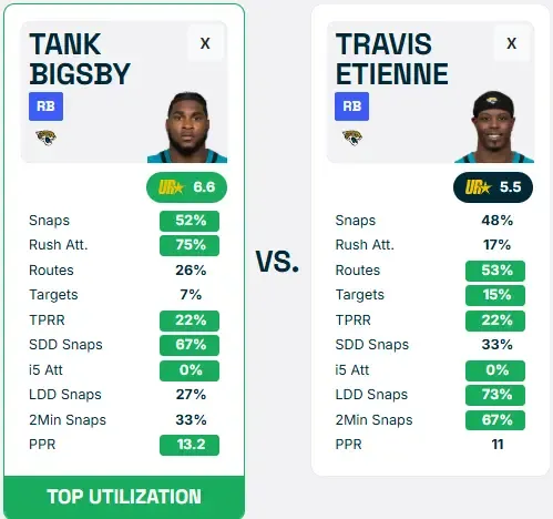 - Week 2: Travis Etienne (miss, but Bigsby was injured), Pickens (hit)