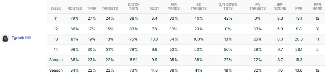 Hill has come to life over the last four games, averaging 19.3 points per game. Over that span, he has WR12, 31, 11, and 5 finishes. However, his success has come due to the eruption of the Dolphins' passing attack, not an improved role. Hill has a 22% target share over the last four games, aligning with his season average.
