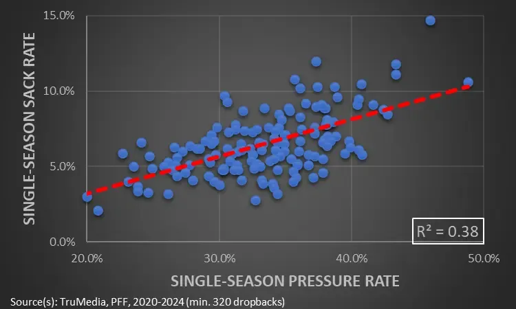 Poor protection or a weak supporting cast (e.g., below-average pass catchers or an inefficient ground game) could influence pressure rate. Slow processing or an inability to get the ball out quicker leads to taking more sacks.