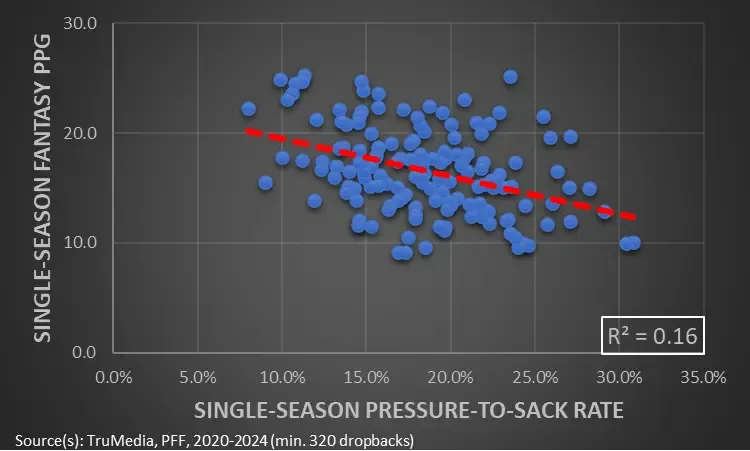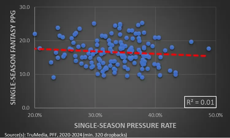 It's a mixed bag, sure. But I see more top-12 finishes than not. Plus, I have fewer questions about their long-term viability as starters than the previous group of QBs. Nevertheless, don’t take my word for it. Let’s apply the same correlation study to pressure rate and fantasy PPG.