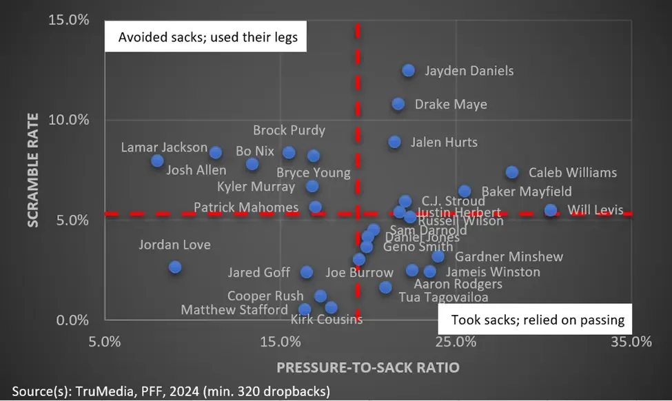 We understand a QB can mitigate pressure with their legs. And even high sack rates (in the context of a drive or offense) aren’t as dire as we think. Using Hurts as the example again, he had the third-highest sack rate. But the Tush Push and his rushing outweighed the lost downs. Jayden Daniels (8.9% sack rate) wasn’t too far behind Hurts, but as the QB3 in offseason best ball drafts, how often he might go down doesn’t matter to fantasy gamers. It’s the sacks relative to the amount of pressure that make the metric more impactful and how we can better gauge a QB’s output for fantasy purposes.