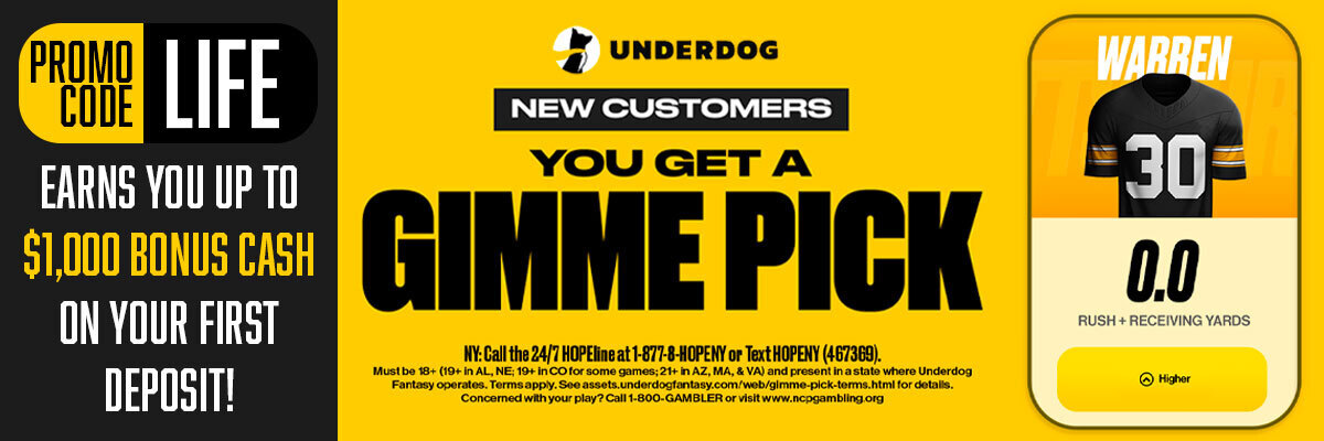 Sign up and claim your free pick today! Pick higher or lower on your favorite players and cash in on Underdog today! New customers will receive a FREE Jaylen Warren pick when you sign up. Sign up for Underdog using our promo code: LIFE and you can earn up to $1,000 Bonus Cash on your first deposit!