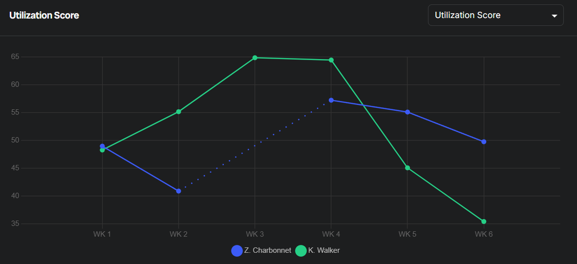 What’s most concerning, though, is Walker’s downward Utilization trend over the past two weeks, including a season-low 34.5% percent snap share in Week 6: