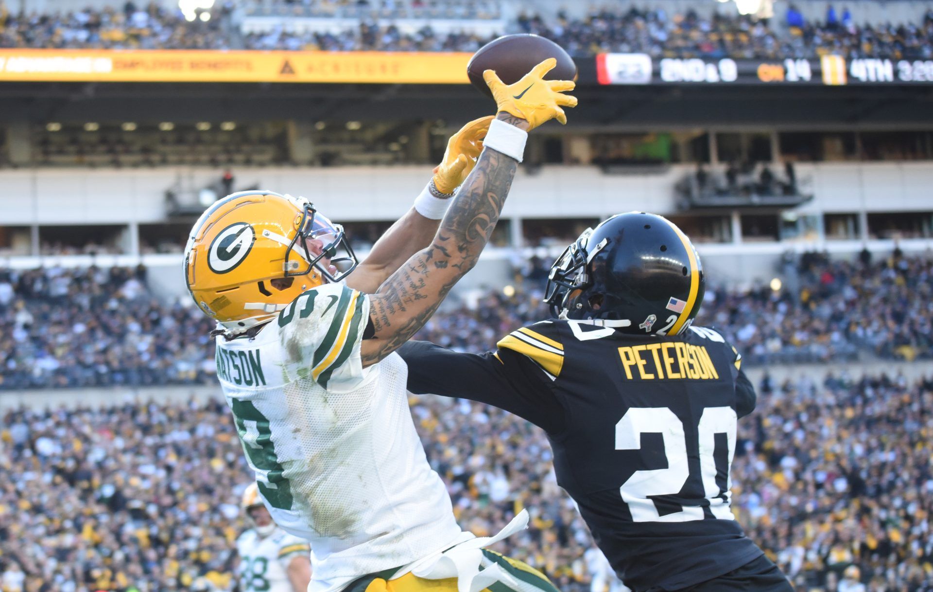 Nov 12, 2023; Pittsburgh, Pennsylvania, USA; A pass intended for Green Bay Packers wide receiver Christian Watson (9) is tipped by Pittsburgh Steelers cornerback Patrick Peterson (20) before being intercepted by safety Keanu Neal (31) during the fourth quarter at Acrisure Stadium. Mandatory Credit: Philip G. Pavely-USA TODAY Sports