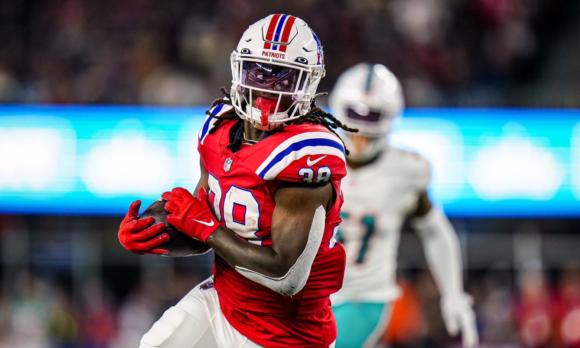 Sep 17, 2023; Foxborough, Massachusetts, USA; New England Patriots running back Rhamondre Stevenson (38) runs the ball against the Miami Dolphins in the second half at Gillette Stadium. Mandatory Credit: David Butler II-USA TODAY Sports