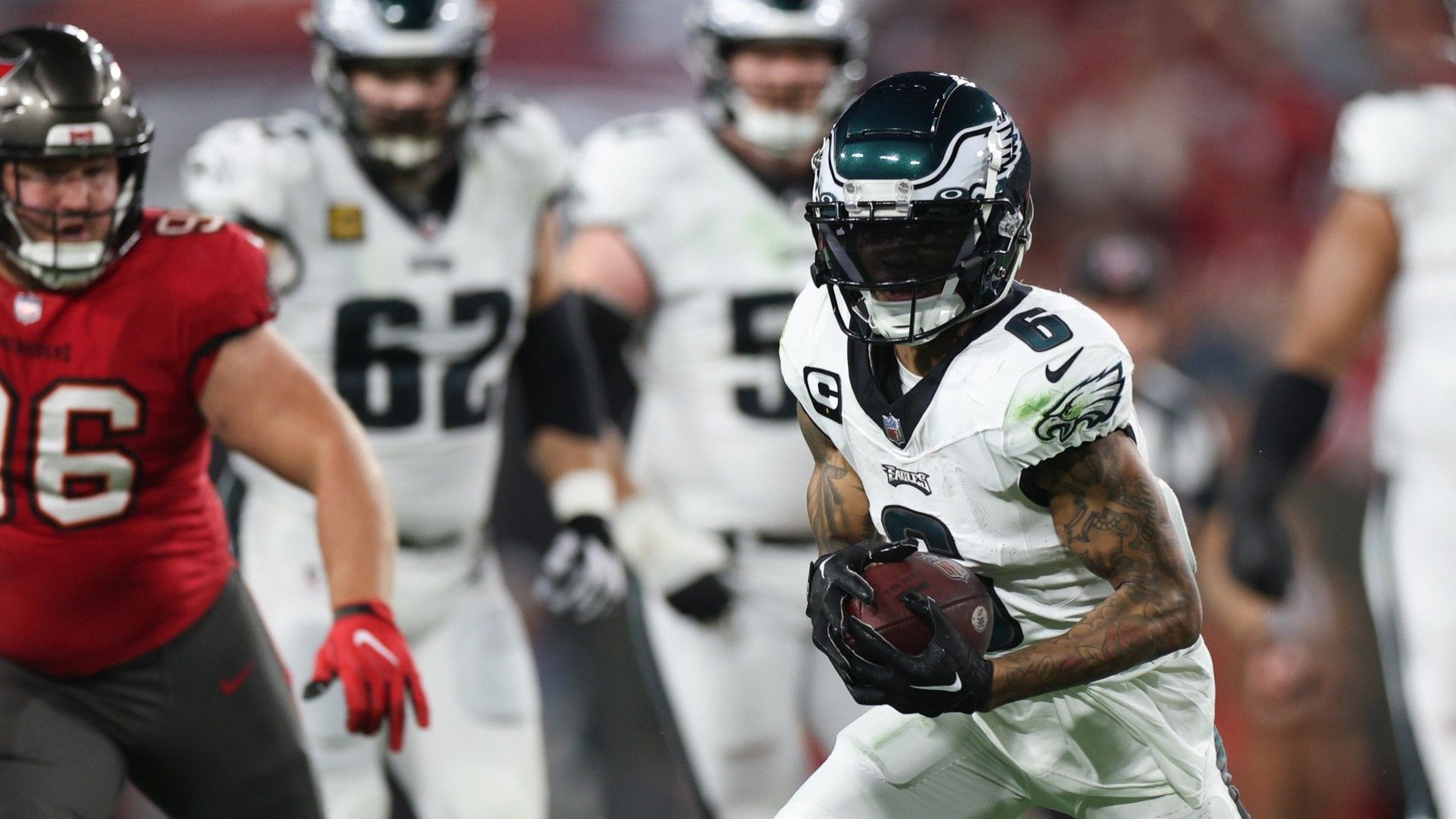 Jan 15, 2024; Tampa, Florida, USA; Philadelphia Eagles wide receiver DeVonta Smith (6) runs the ball against the Tampa Bay Buccaneers during the first half of a 2024 NFC wild card game at Raymond James Stadium. Mandatory Credit: Nathan Ray Seebeck-USA TODAY Sports